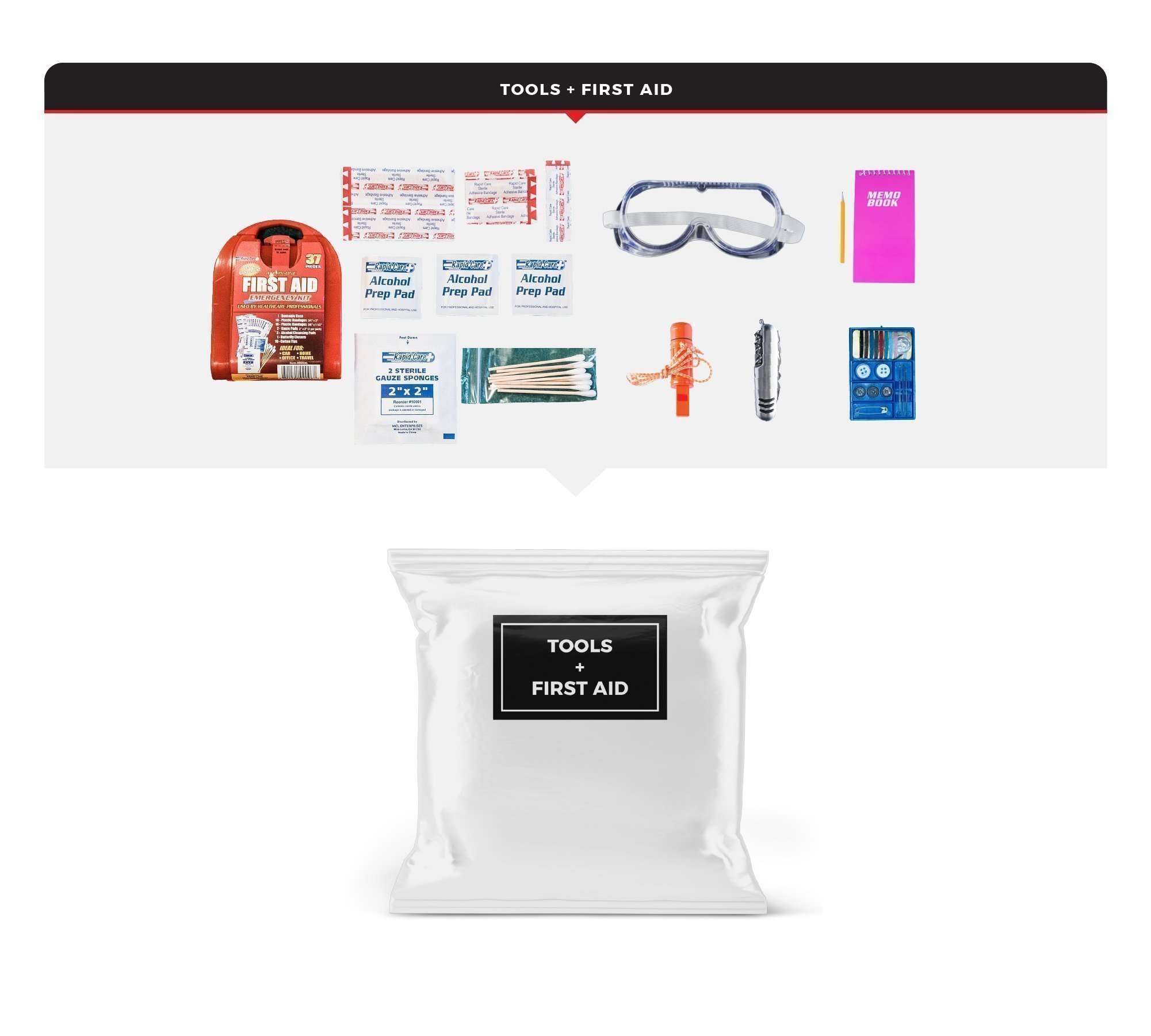 Tools and First Aid: These tools can be useful when you need help with navigation, transport, personal protection, or shelter. A  first aid kit can be used to treat minor injuries and protect against more serious health threats in a disaster.
