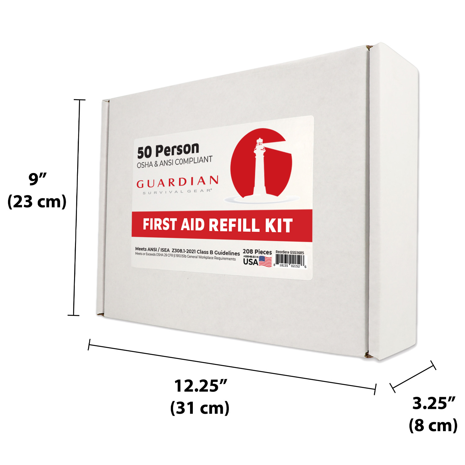 Guardian Survival Gear First Aid Refill/Upgrade, 208 Pieces, ANSI Class B, 25 to 50 Person. Meets requirements for ANSI This ANSI First Aid Refill includes the assortment and quantity of first aid supplies intended to deal with most types of injuries and sudden illnesses encountered in the workplace including: major wounds, minor wounds (cuts and abrasions), minor burns, sprains and strains, and eye injuries. The Guardian Survival Gear First Aid ANSI B refill is great for workplaces ranging from offices to production facilities and warehouses of up to 50 people.