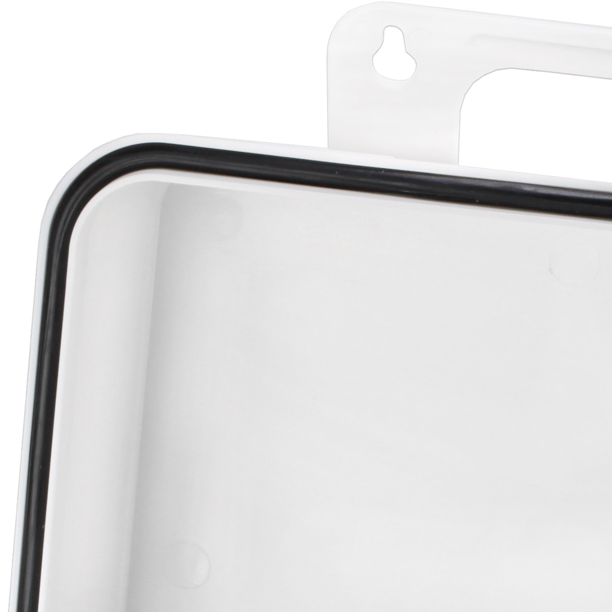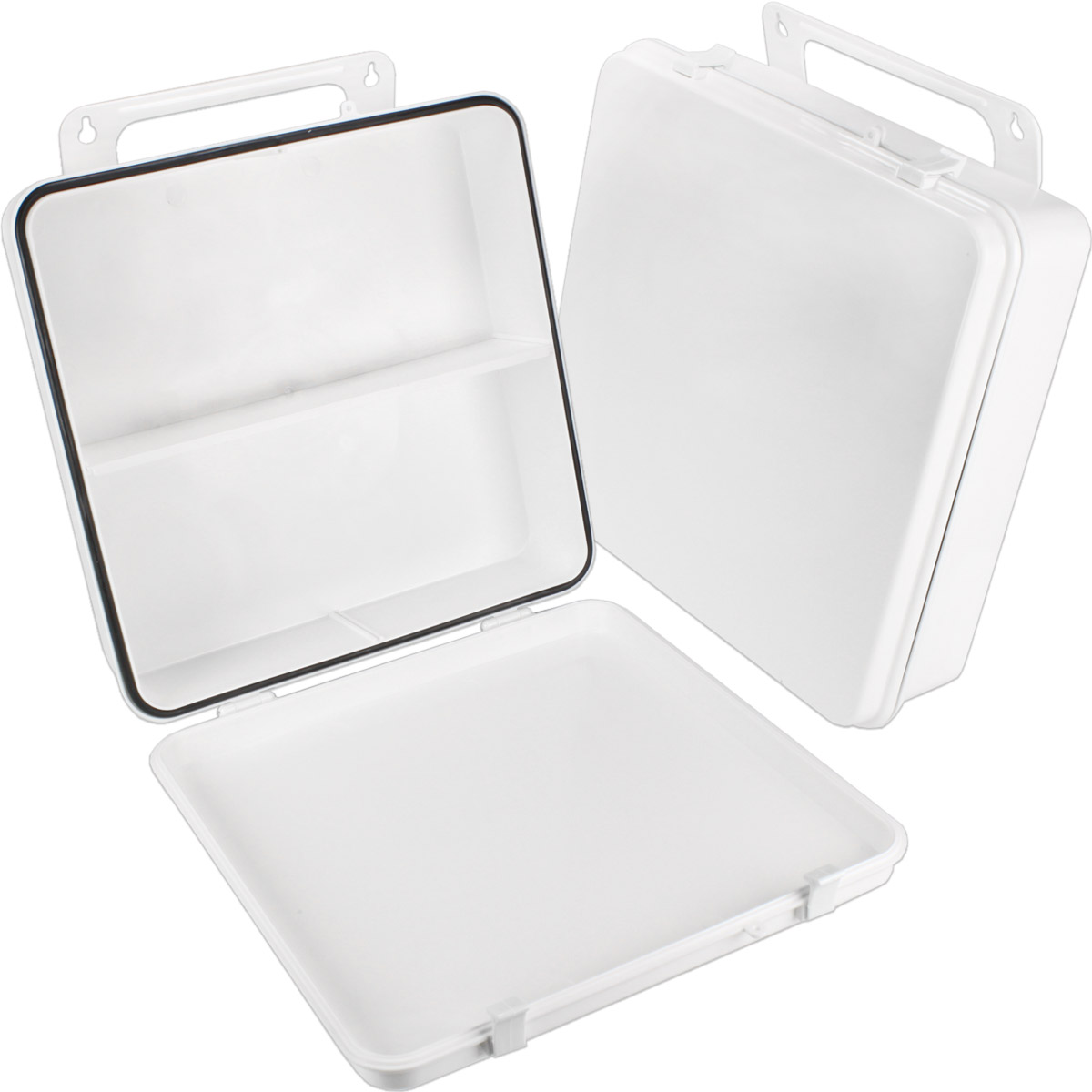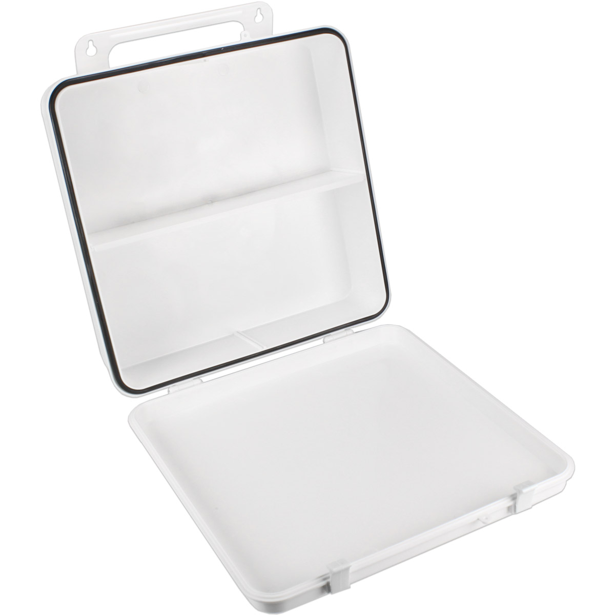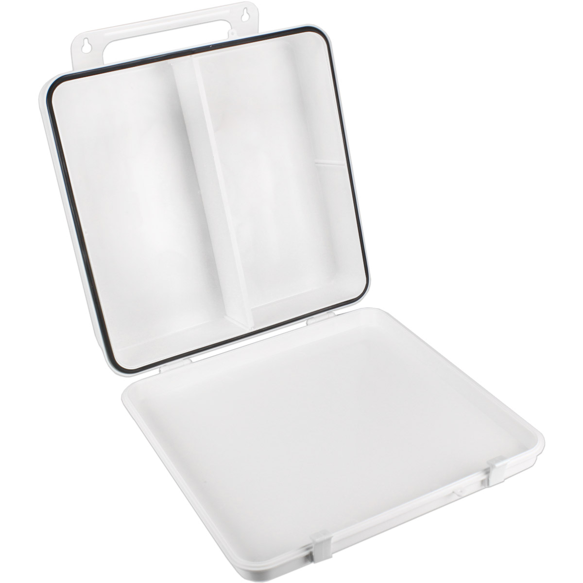 24 Unit, Empty Polypropylene Case w/ Gasket & Handle Hanger, 9-3/16"x9-3/16"x2-3/4" - 1 Each This empty plastic first aid case holds up to 24-units of product and features a gasket and polypropylene handle hanger. Case Dimensions: 9-3/16"x9-3/16"x2-3/4"