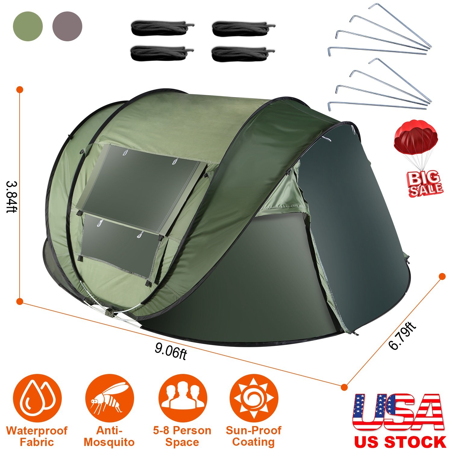 Our camping tent with unfolded size of 9.06x6.79x3.84ft, can hold up to 8 people, great for taking for travel with your families or friends. Designed with 4 symmetrical windows and dual doors with net and curtain, can effectively prevent mosquito and ensure excellent air circulation. Easy to set up by taking it out. It will auto open within 1 second. Designed with dual pockets inside for holding snacks or toys and hook on top for hanging a light conveniently at night for illumination. Comes with a carrying bag for quick storage and easy travel. Perfect for camping, hiking, climbing, etc..