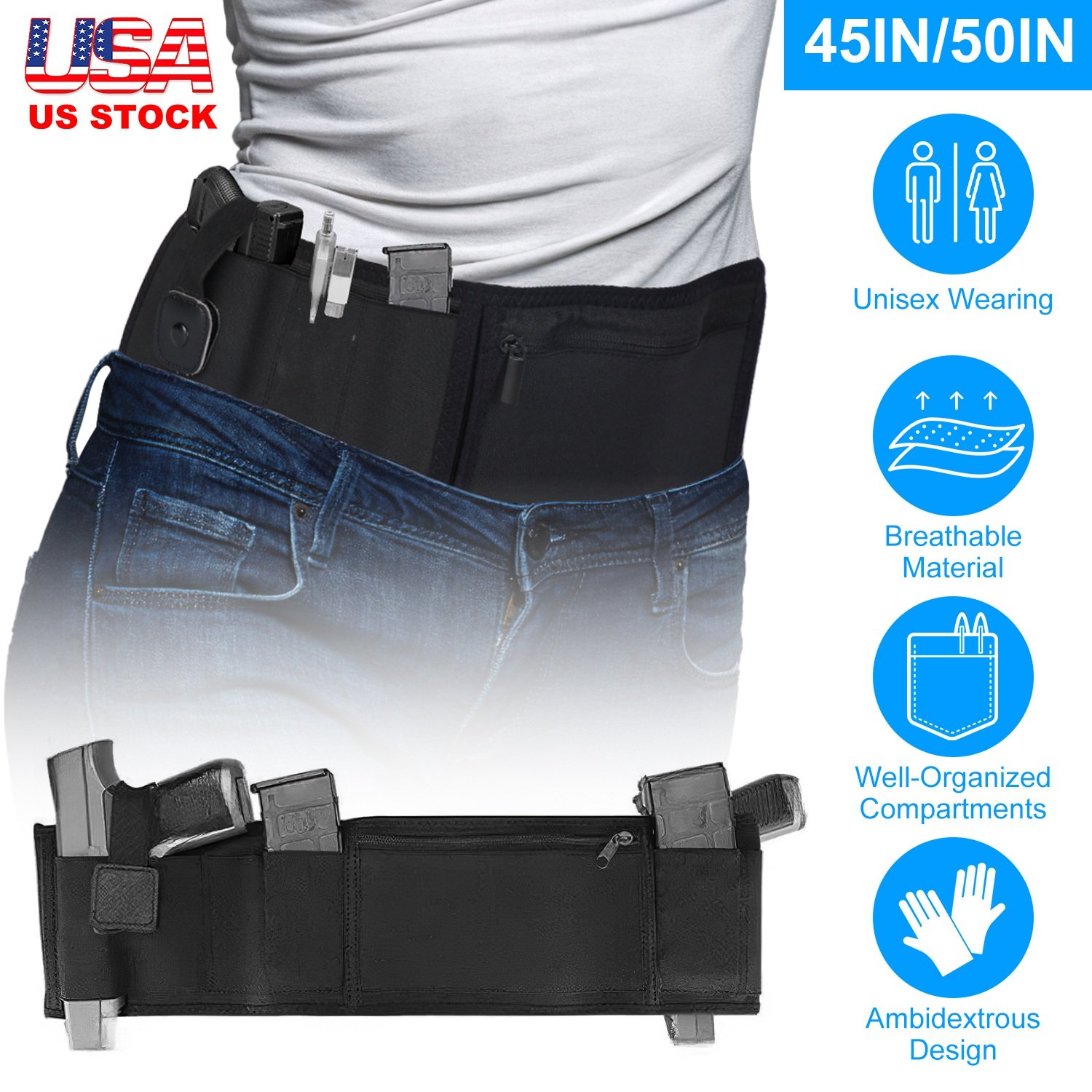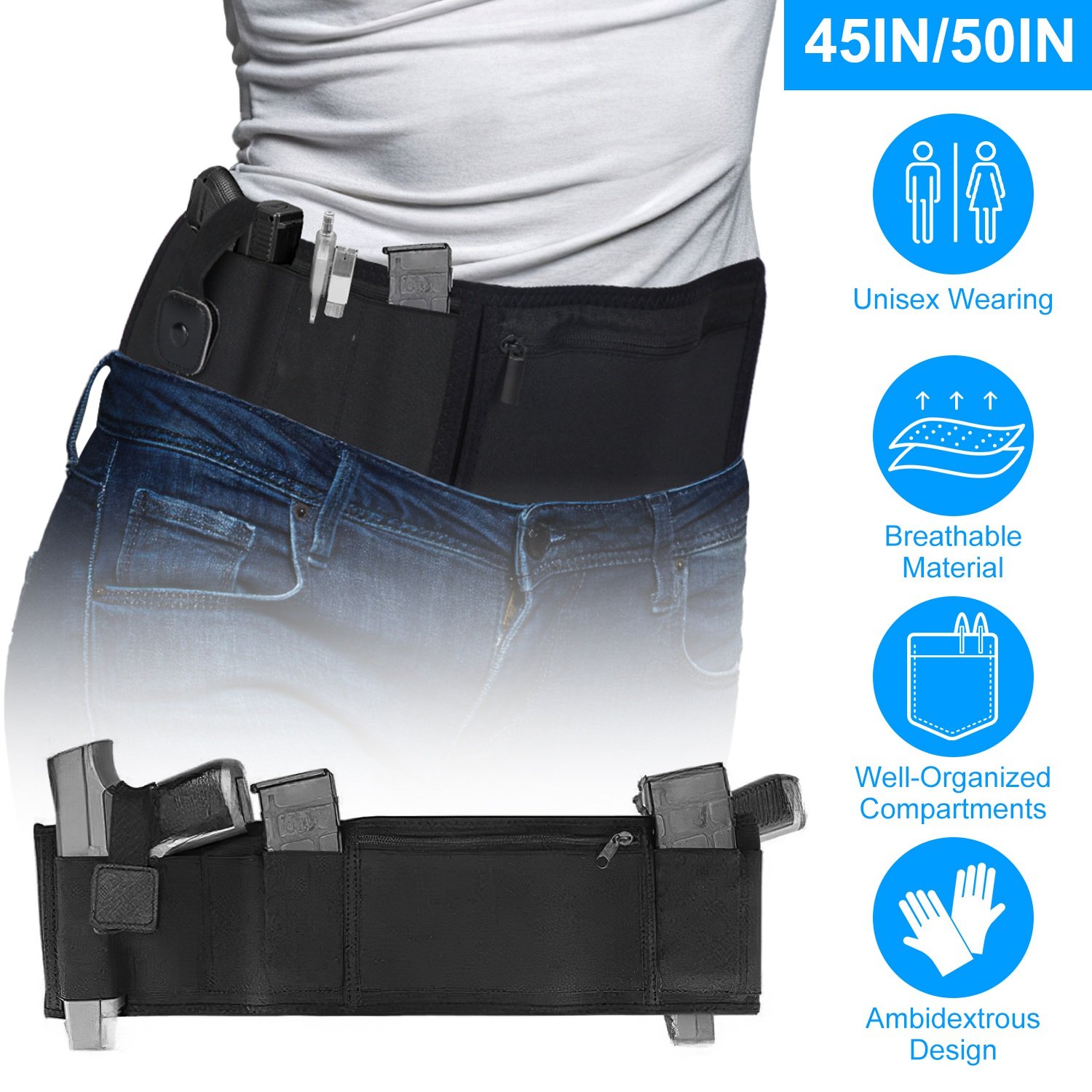Available in L/XL sizes, our concealed carry belly band holster fits for man or woman whose waist circumference under 45in/50in. Designed with 2 elastic holster pockets with buckles, this waistband holster can accommodate to both left and right hand secure and rapid drawing. Well-organized compartments can hold your various items and keep them safe. Made of lightweight, soft and comfortable neoprene with breathable air vented holes, you can wear it for all day long under any kinds of outfits without showing marks. Widely compatible with Glock, Smith and Wesson, Bodyguard, M&P Shield, Sig Sauer, and so on.